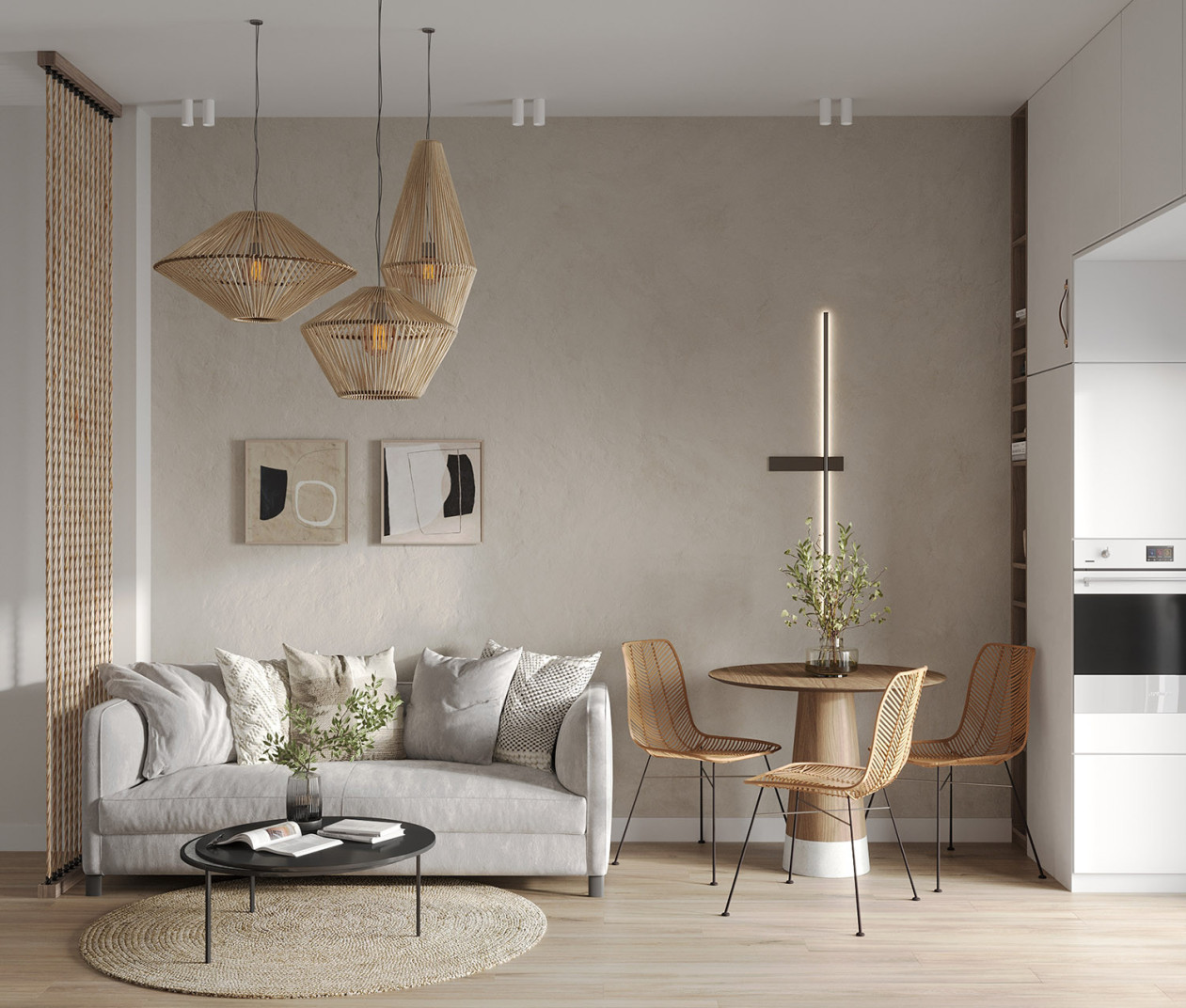 The project scope was to turn a one-bedroom into a two-bedroom Airbnb apartment. An additional room was created by extending and repurposing the existing kitchen and changing the former living room into a combined kitchen-dining-living space. Since the spaces so formed were small and narrow, the interior colors are kept light and neutral. Everything is well-packed, with custom furniture to use the maximum potential of the space.