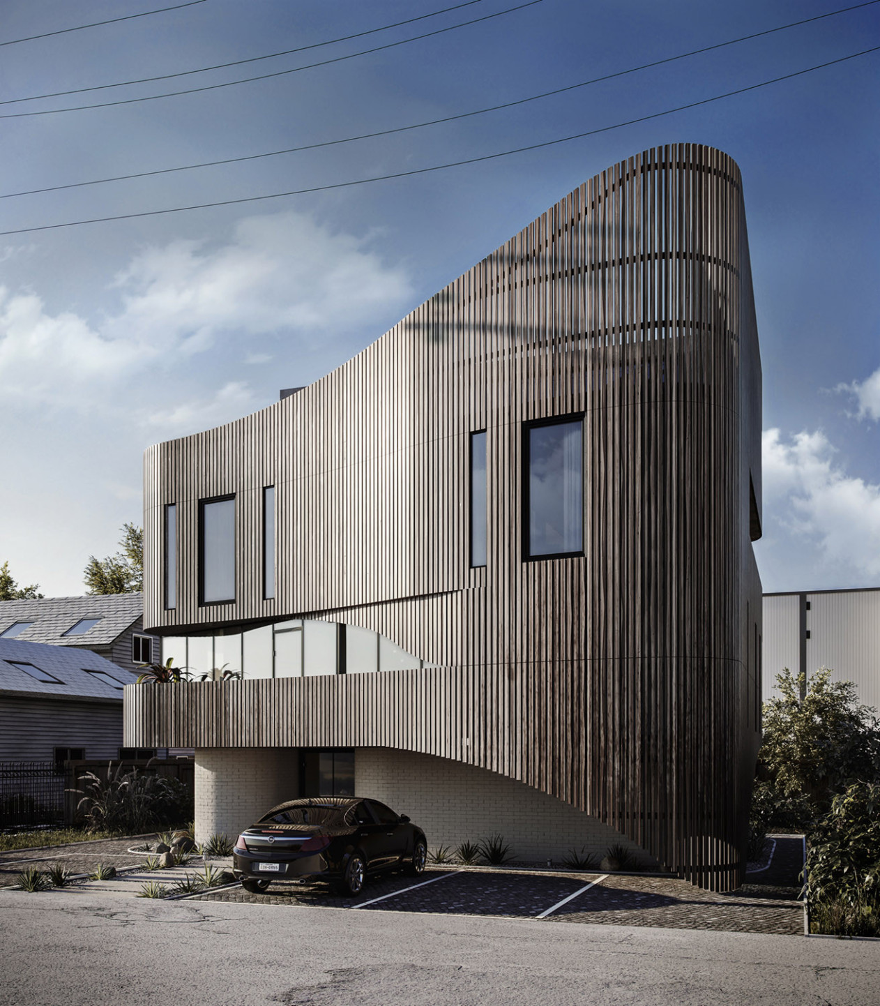 Nestled in Houston, USA, this residential gem boasts two apartments and a cozy micro-unit atop, complemented by inviting communal spaces. Designed with precision, the architecture gracefully integrates with the plot's contours, offering a fluid form that evolves beautifully from every angle. Vertical accents and expansive windows add depth and elegance, while strategically placed terraces create a dynamic visual appeal. Parking convenience, spacious living, and a rooftop oasis await, all crafted with the signature warmth and charm of American wooden framing. Welcome to a harmonious blend of form and function, tailored to Houston's vibrant spirit.