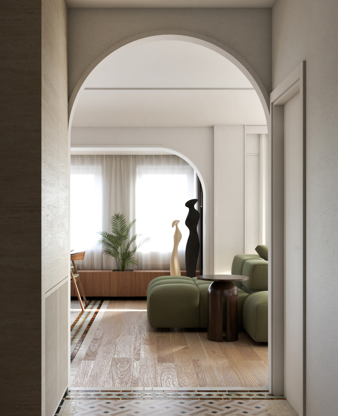 Since the first impression of a space is formed when entering a room from the hallway, it is important to treat this view with special attention. For this reason, we added a large sculpture, centered in the passage, which became the focal point, while the entire view is framed by arches that are visible through one another.