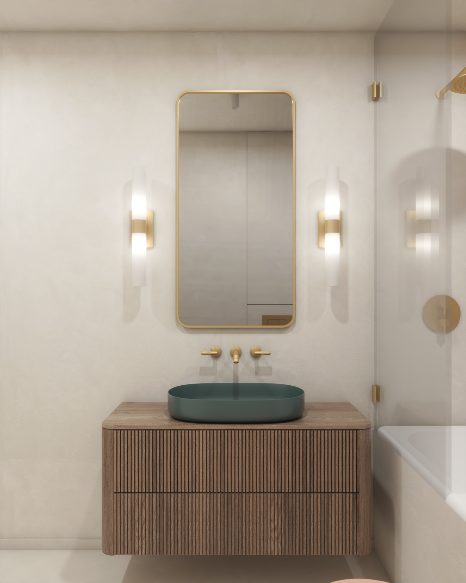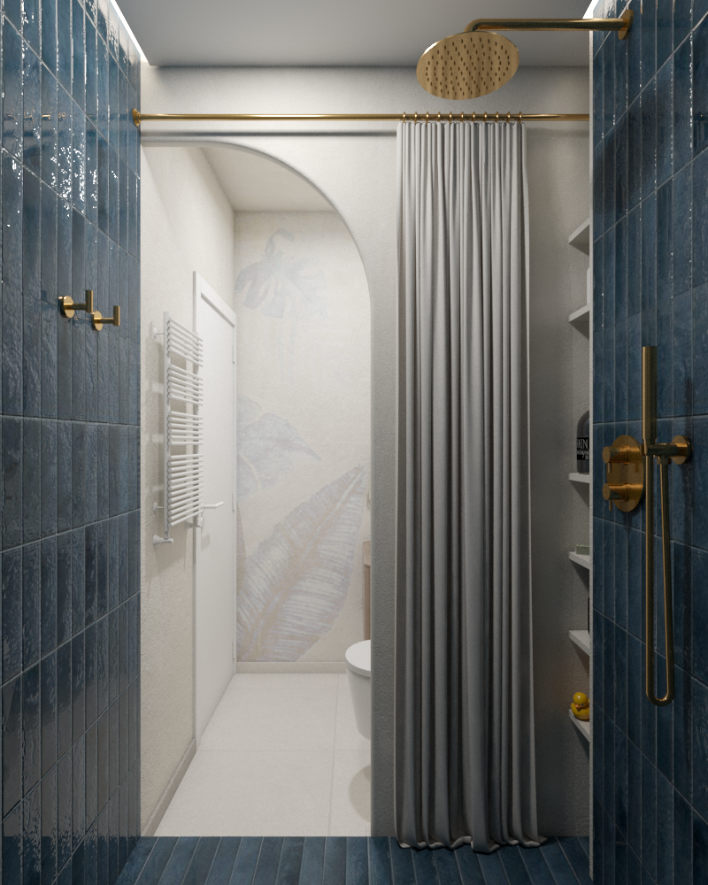 The main and spacious bathroom in this apartment was designed based on the clients' unique inspiration. Their desire was for the space to exude a playful and colorful vibe, which we achieved by combining blue and pastel pink tiles on the feature wall. Subtle accents, such as colored sanitary fixtures and gold faucets and showerheads, further enhance the elegance of the space. The design is cohesive, with rounded, curved, and ribbed forms harmoniously integrating into the overall aesthetic.