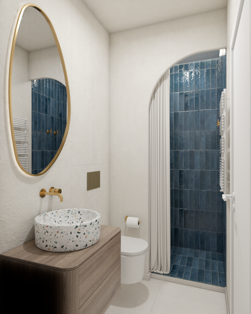 The shower room was designed as a harmonious blend of carefully selected details, with the client’s wish for simplicity in mind. White dominates the space, while the tiles in the shower area serve as a striking and impactful feature, creating a strong visual impression. A gold showerhead and faucet, along with a rounded terrazzo sink, further enhance the sophistication of the space. Soft, rounded surfaces contribute to the overall harmony, creating a comfortable and pleasant atmosphere in this bathroom.