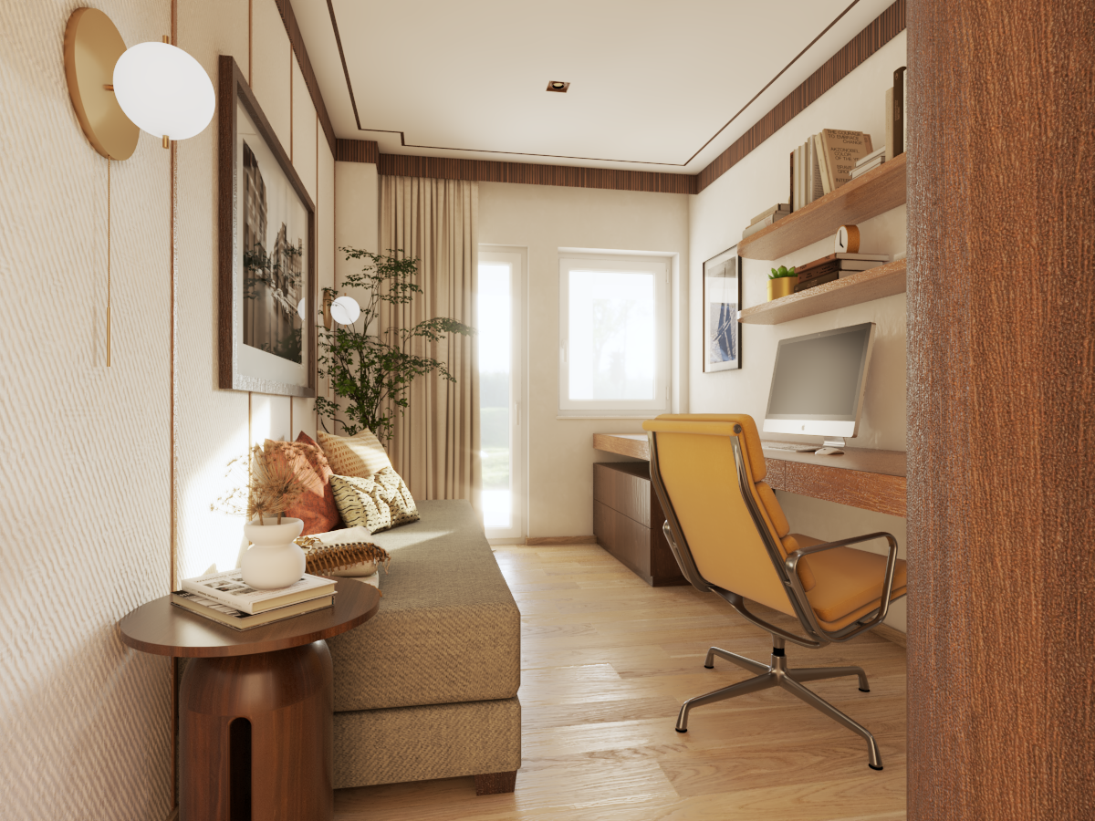 We focused on the elegance of the ambiance, featuring solid wood elements adorned with geometric carvings, which break up the monotony of the long desk that extends into a sideboard. The desk is highlighted by a designer Louis Poulsen lamp, while black-and-white photographs on the walls further contribute to the sophisticated atmosphere. A foldable bed is cleverly concealed, and the wall behind it is covered with wallpaper and wooden slats, adding extra visual depth to the space.