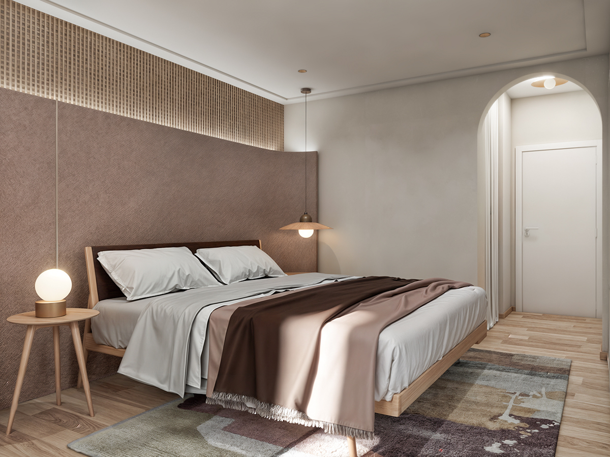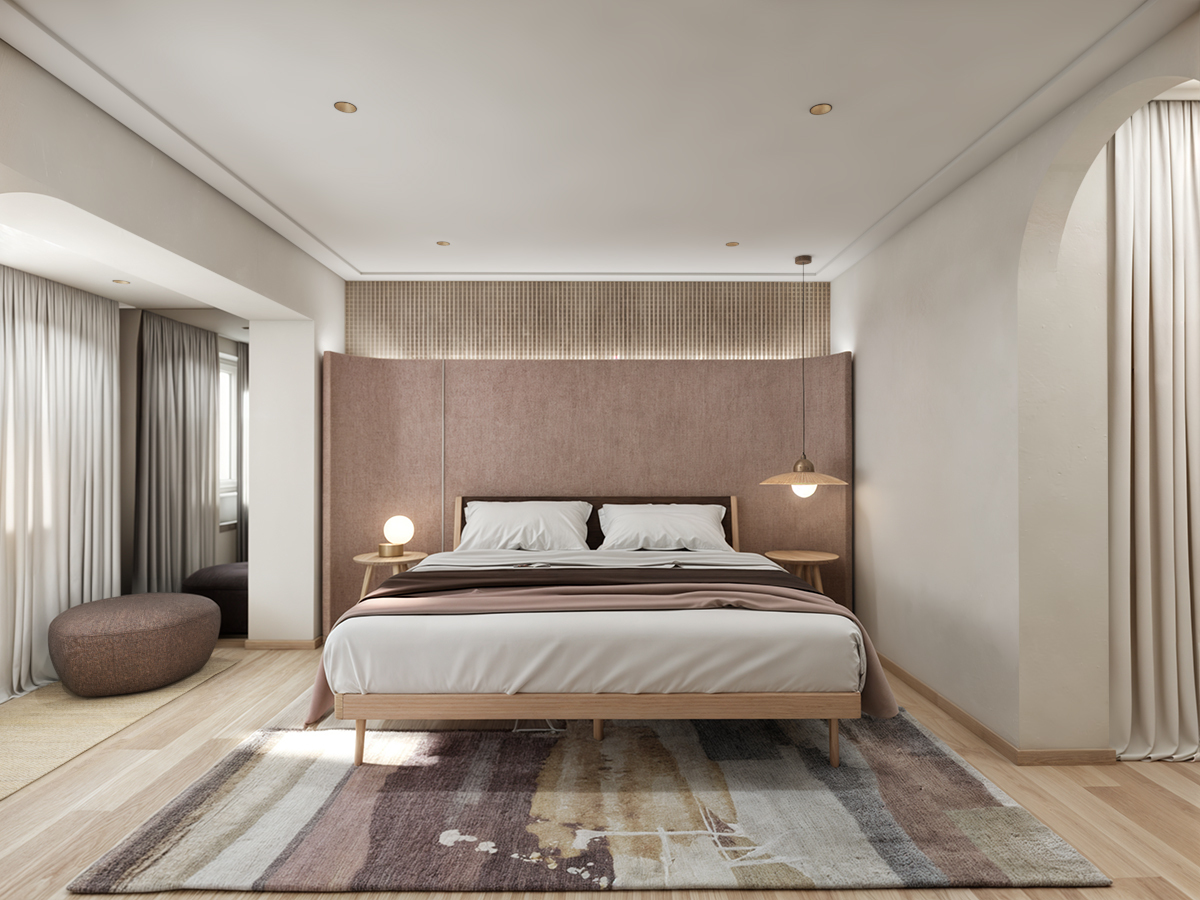 Behind the headboard, an LED strip highlights a woven wooden panel, and for accents, we chose a patterned rug with fluid design and asymmetrical lighting.