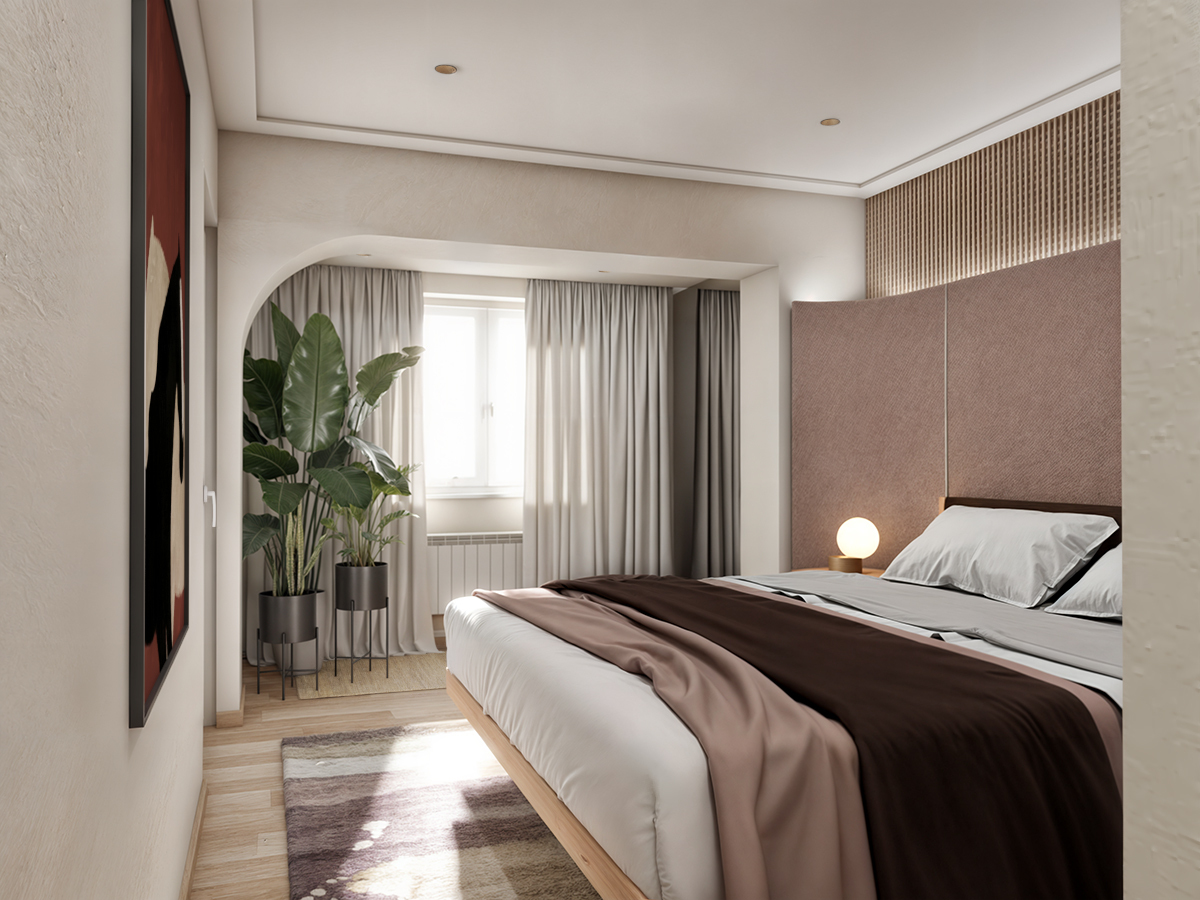 Modern and elegant, the bedroom exudes character through its rich variety of textures that enhance every surface. Our biggest challenge was dealing with a beam that divides the room and reduces the amount of natural light entering the space. We found a solution in a mirror, which reflects light and distributes it throughout the room, while arches were added to soften and elevate this cozy retreat.