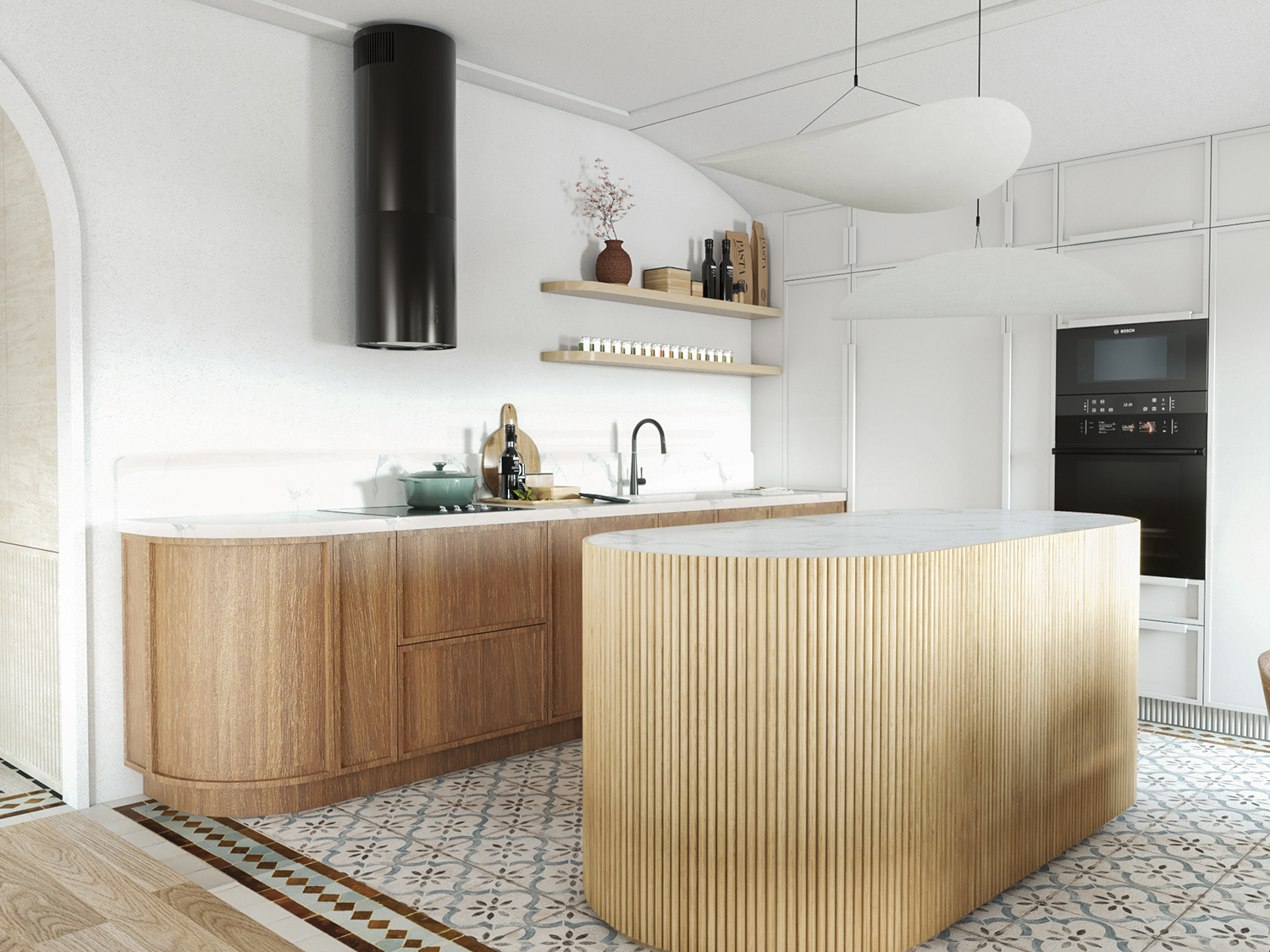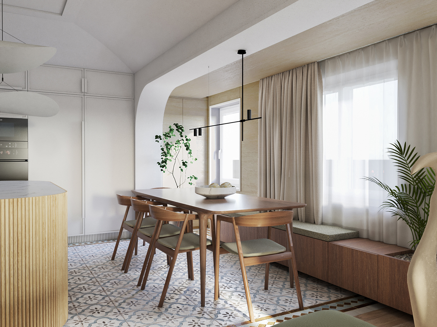 Inspired by history and oriented towards the river, the apartment is imbued with a richness of textures that evoke stone, ancient fragments, and archaeological excavations. To complement this direction, we used techniques such as mosaic, carved wood, and plaster arches.
