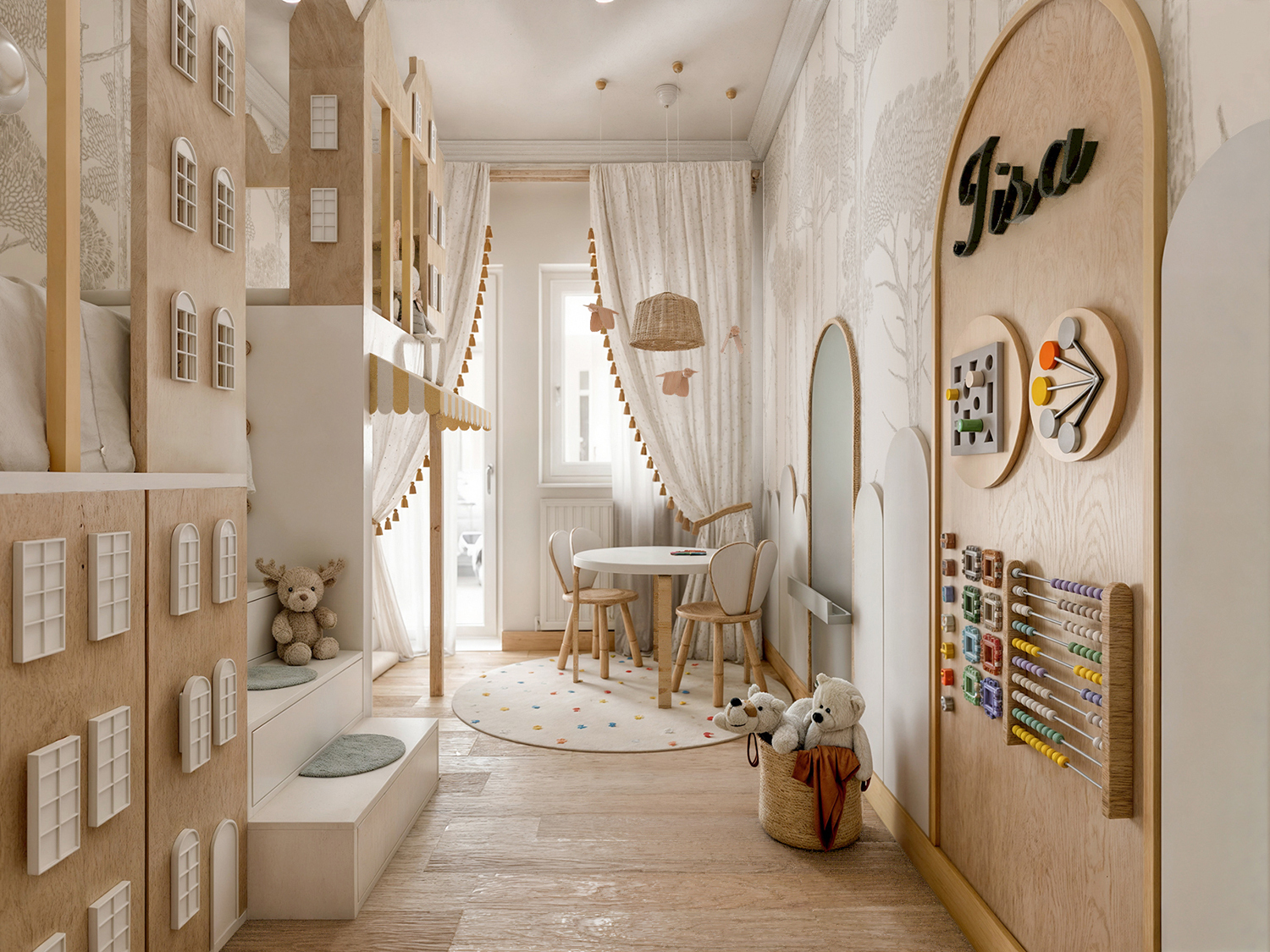 Along the right wall, arched panels add a unique aesthetic element as well as functionality. Some of these panels contain puzzles and a drawing board, allowing children to express themselves and learn through play.