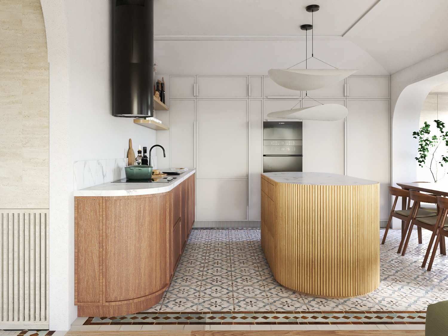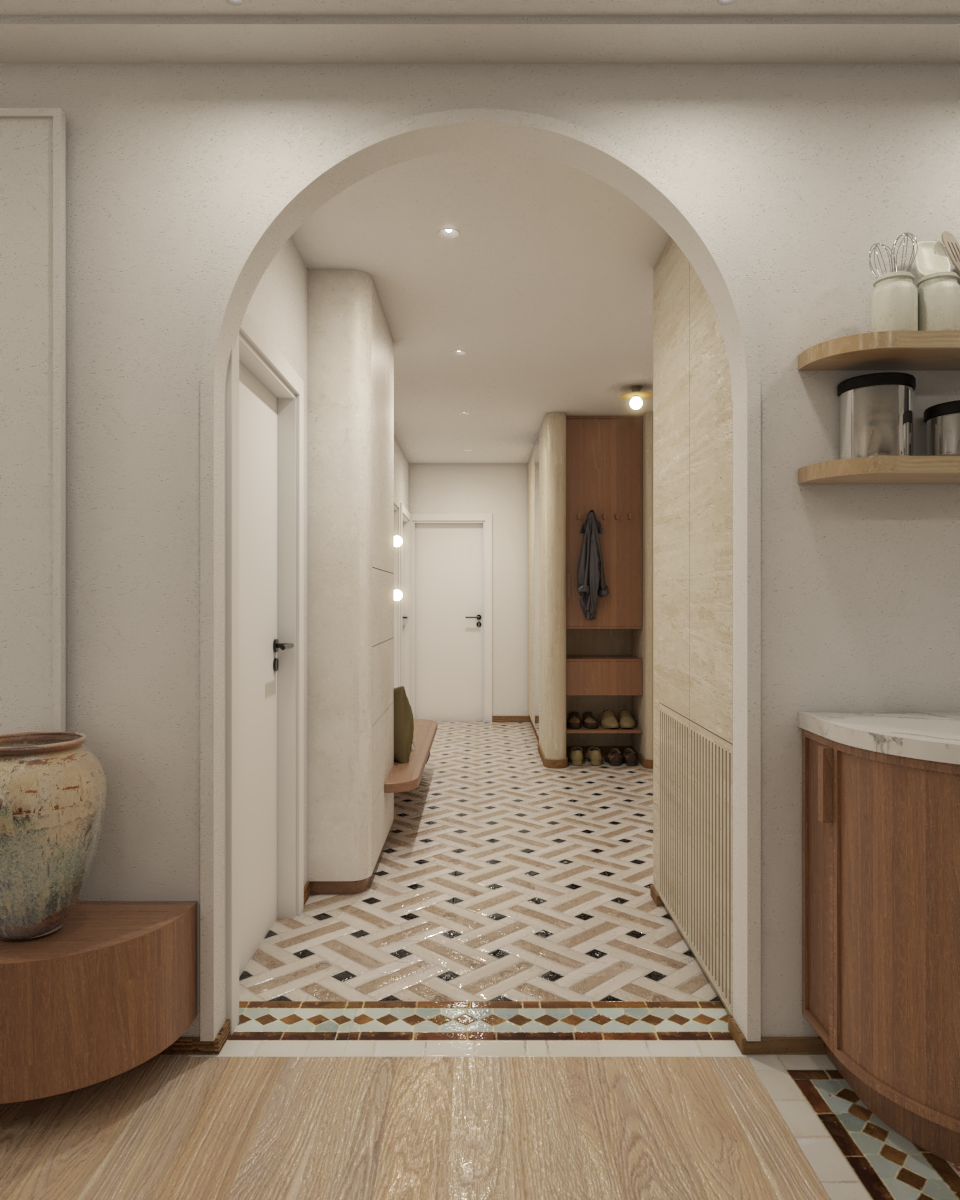 Inspired by history and oriented towards the river, the apartment is imbued with a richness of textures that evoke stone, ancient fragments, and archaeological excavations. To complement this direction, we used techniques such as mosaic, carved wood, and plaster arches.