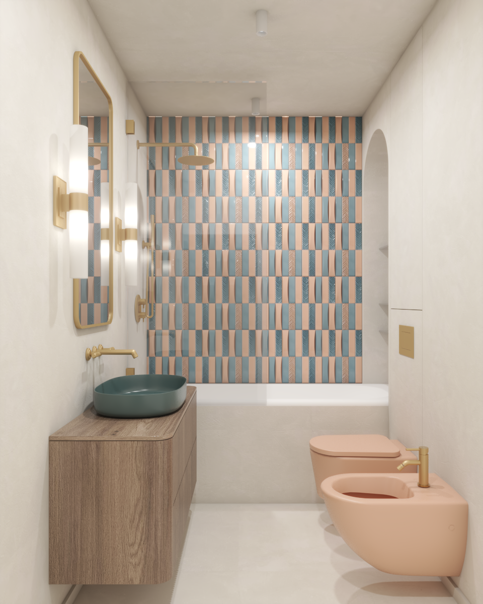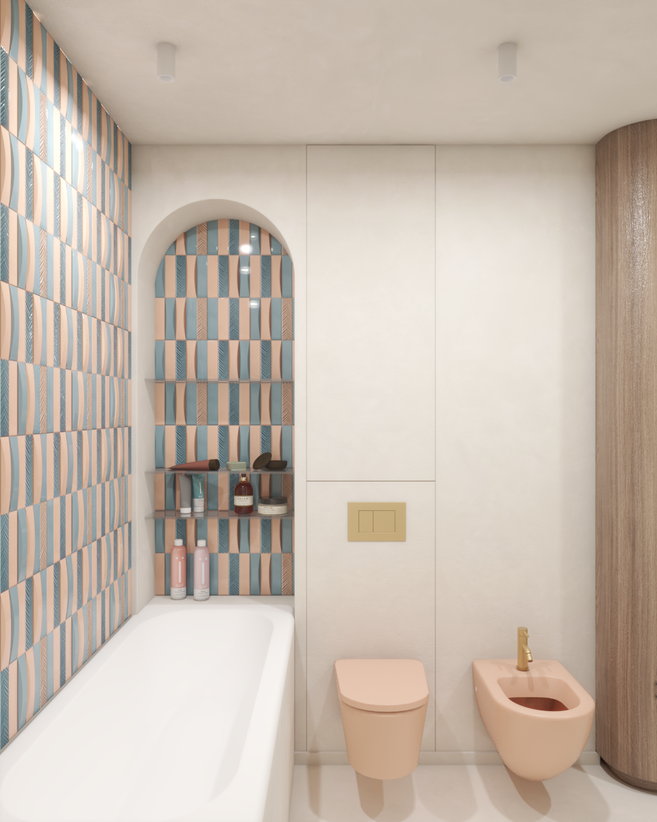 The main and spacious bathroom in this apartment was designed based on the clients' unique inspiration. Their desire was for the space to exude a playful and colorful vibe, which we achieved by combining blue and pastel pink tiles on the feature wall. Subtle accents, such as colored sanitary fixtures and gold faucets and showerheads, further enhance the elegance of the space. The design is cohesive, with rounded, curved, and ribbed forms harmoniously integrating into the overall aesthetic.