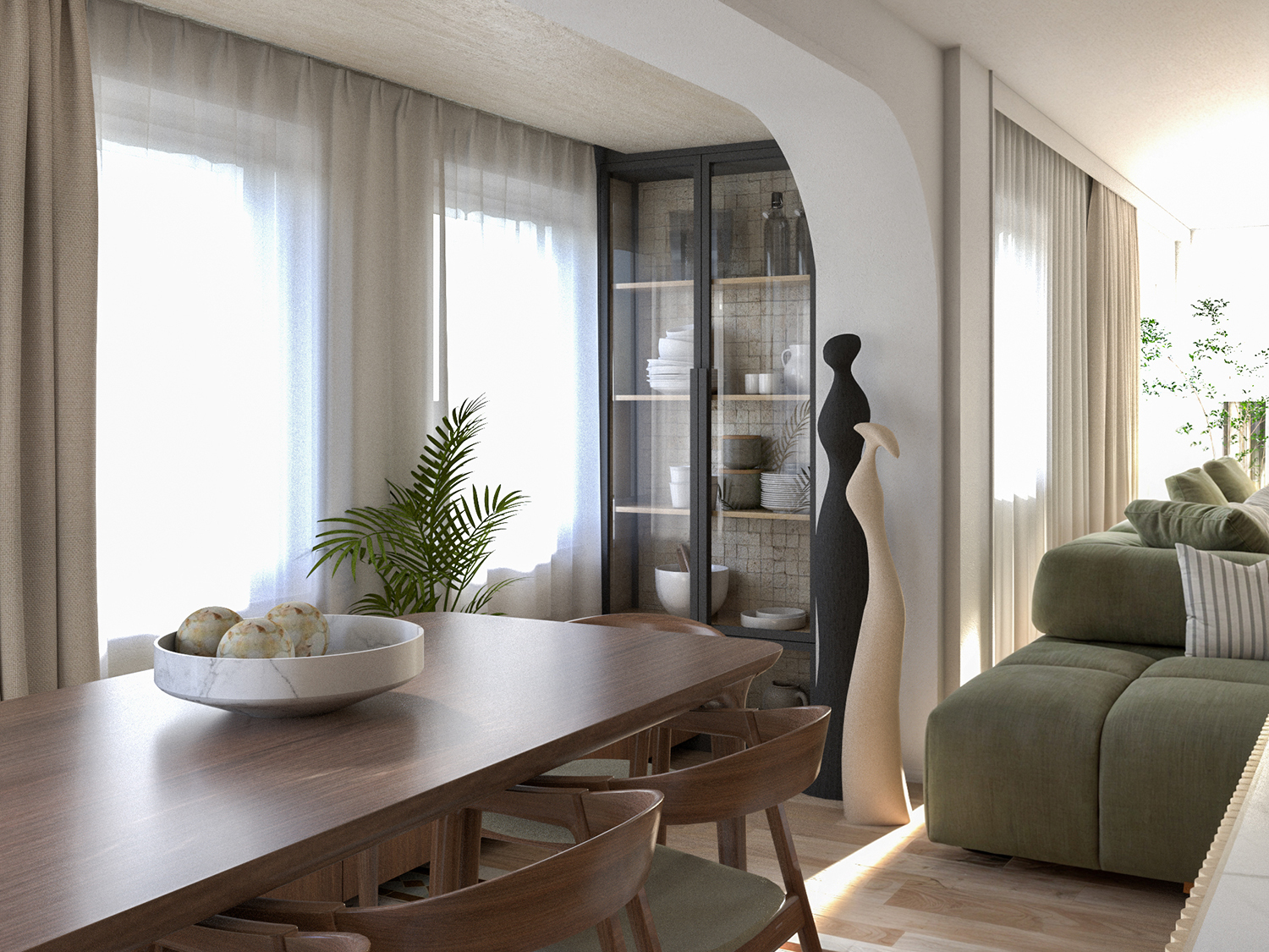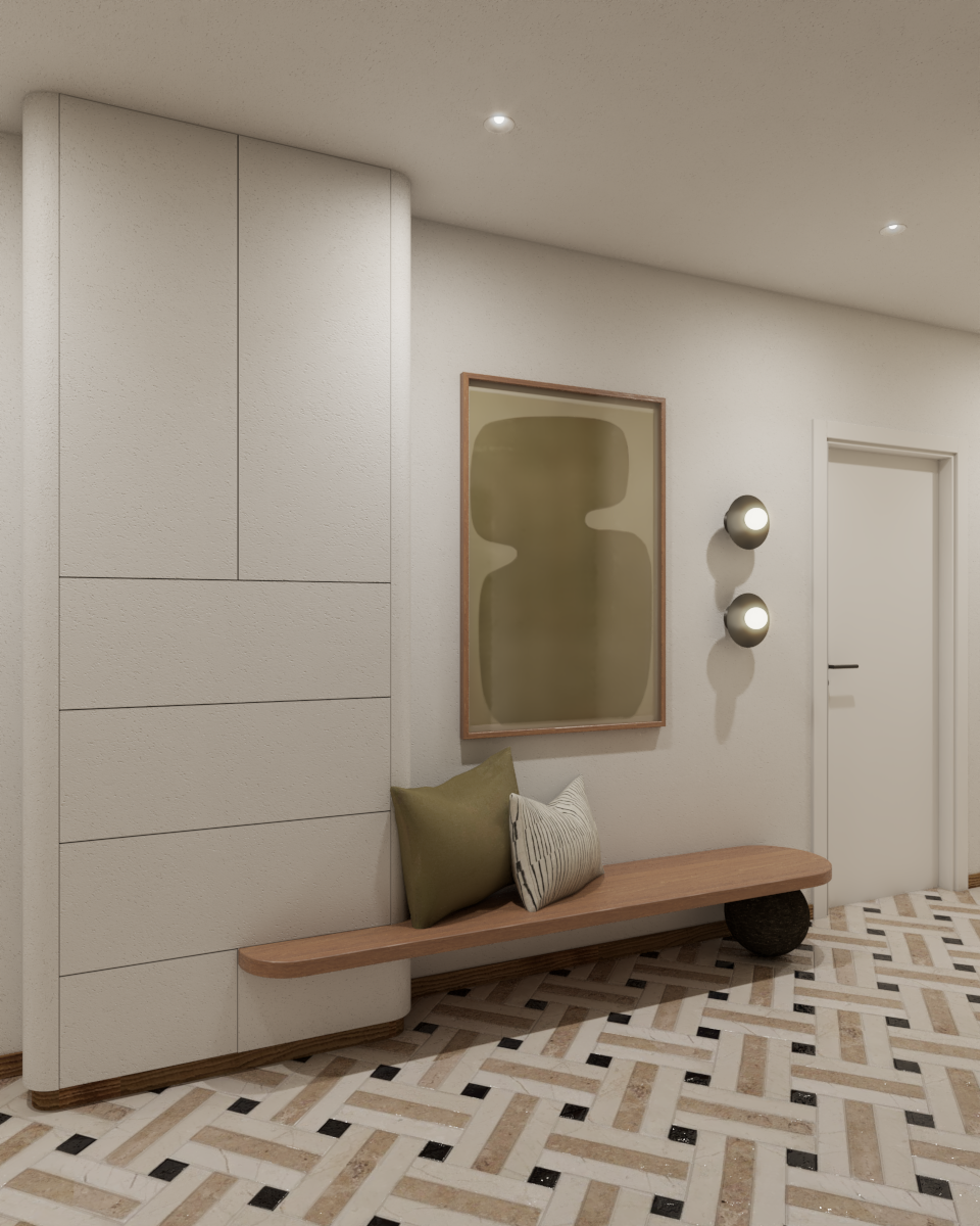 Since the first impression of a space is formed when entering a room from the hallway, it is important to treat this view with special attention. For this reason, we added a large sculpture, centered in the passage, which became the focal point, while the entire view is framed by arches that are visible through one another.