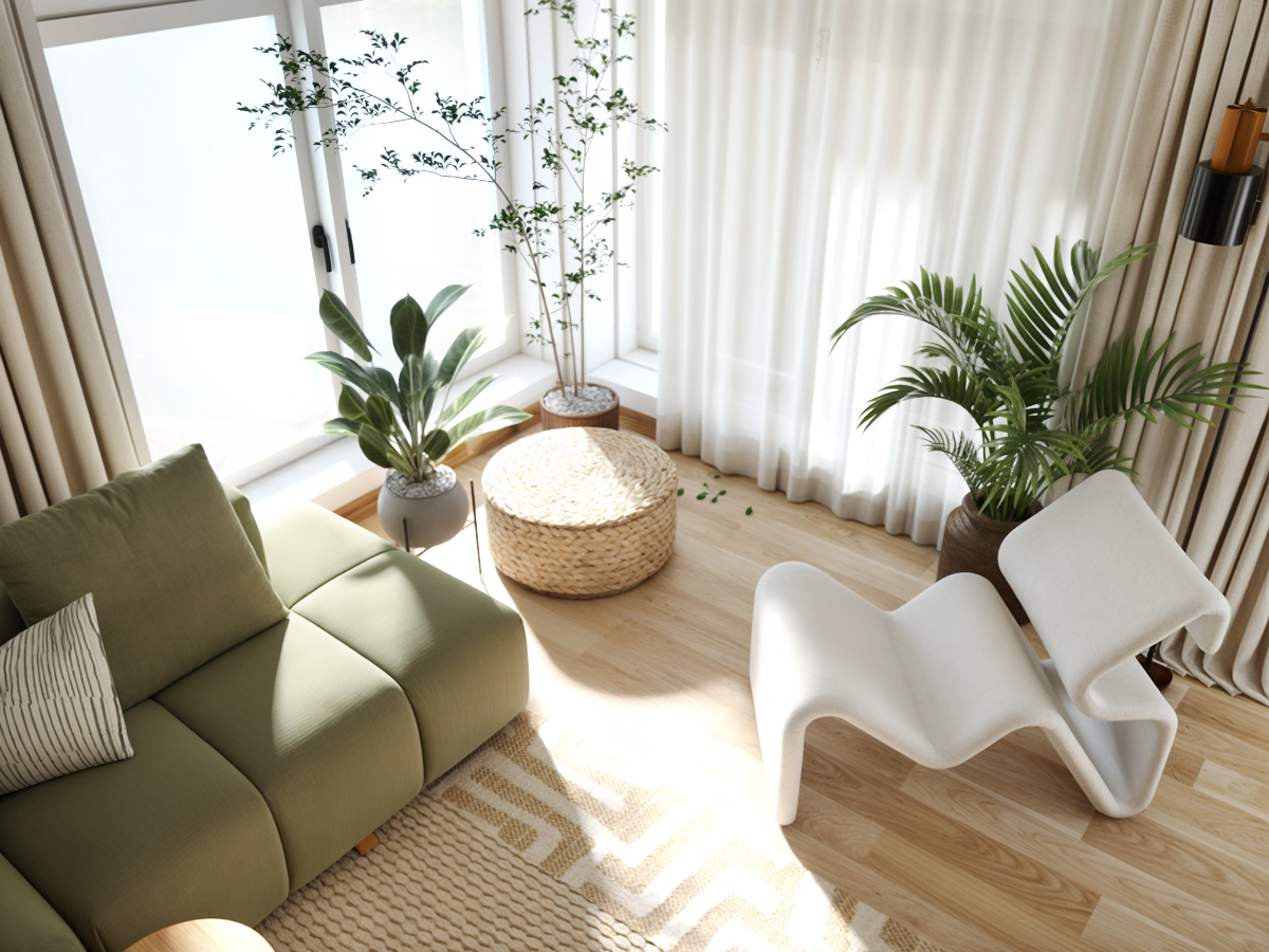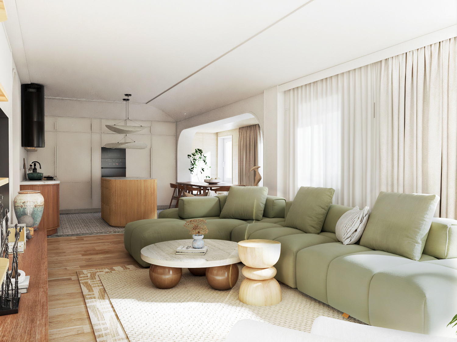 The modular sofa in a beautiful soft green color, as a statement piece, dictated the direction of the design from the very beginning. The room is enriched with textures that we tried to incorporate into every detail. Layering one rug over another adds a new play of patterns, while the plants by the window are inspired by the Tamiš River and the forest across from it. The second focal point is the armchair, which holds an important place, and for that reason, it had to be unusual, interesting, and designer-made. The color palette is inspired by archaeology – the warm hues of dry earth or stone walls are subtly woven throughout the interior.