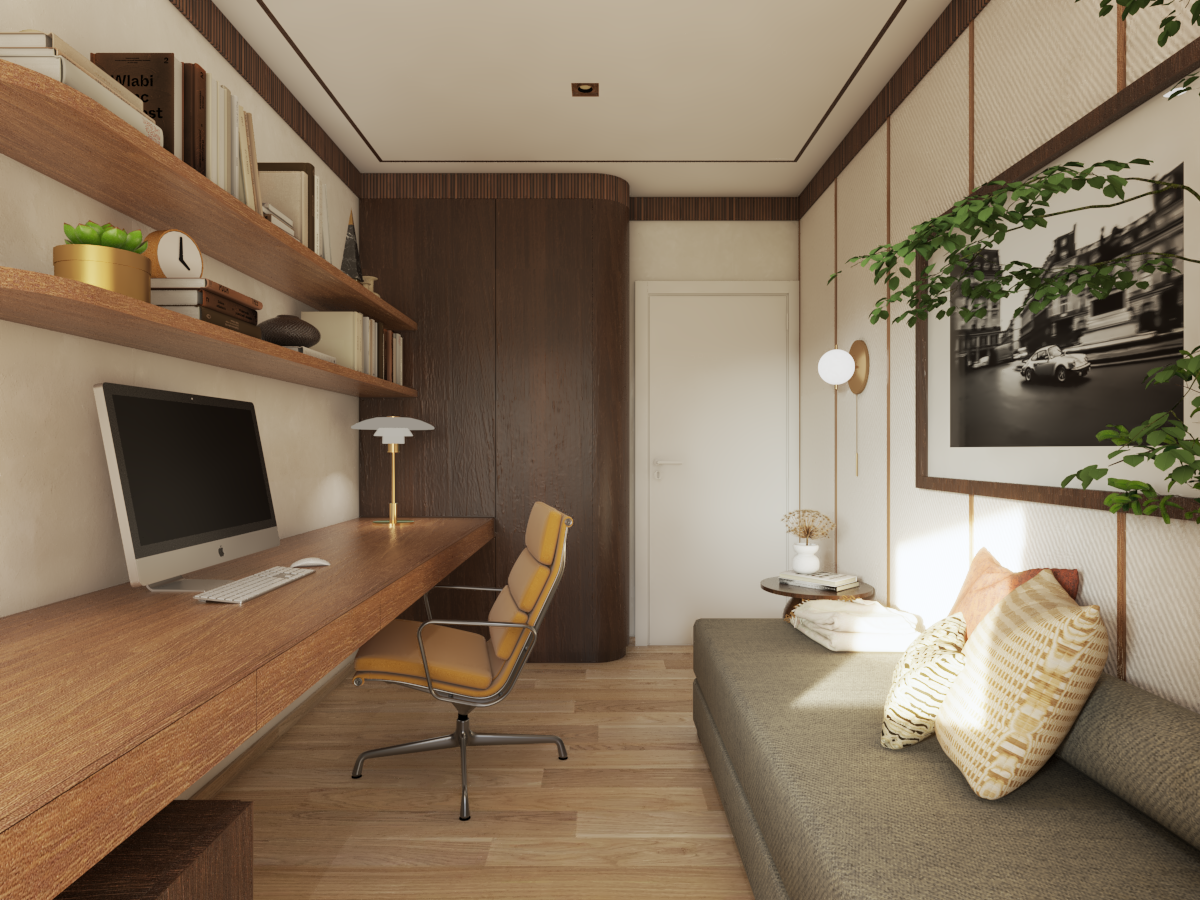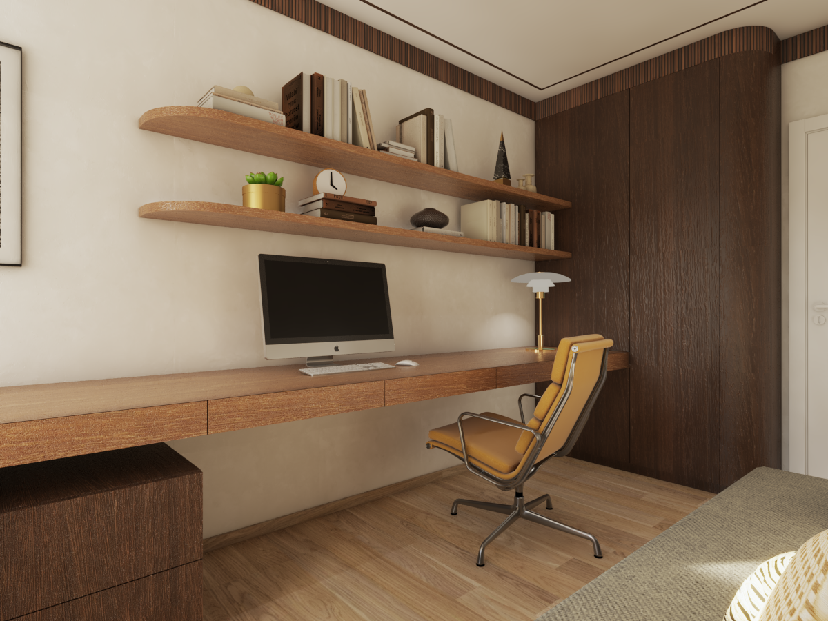 We focused on the elegance of the ambiance, featuring solid wood elements adorned with geometric carvings, which break up the monotony of the long desk that extends into a sideboard. The desk is highlighted by a designer Louis Poulsen lamp, while black-and-white photographs on the walls further contribute to the sophisticated atmosphere. A foldable bed is cleverly concealed, and the wall behind it is covered with wallpaper and wooden slats, adding extra visual depth to the space.