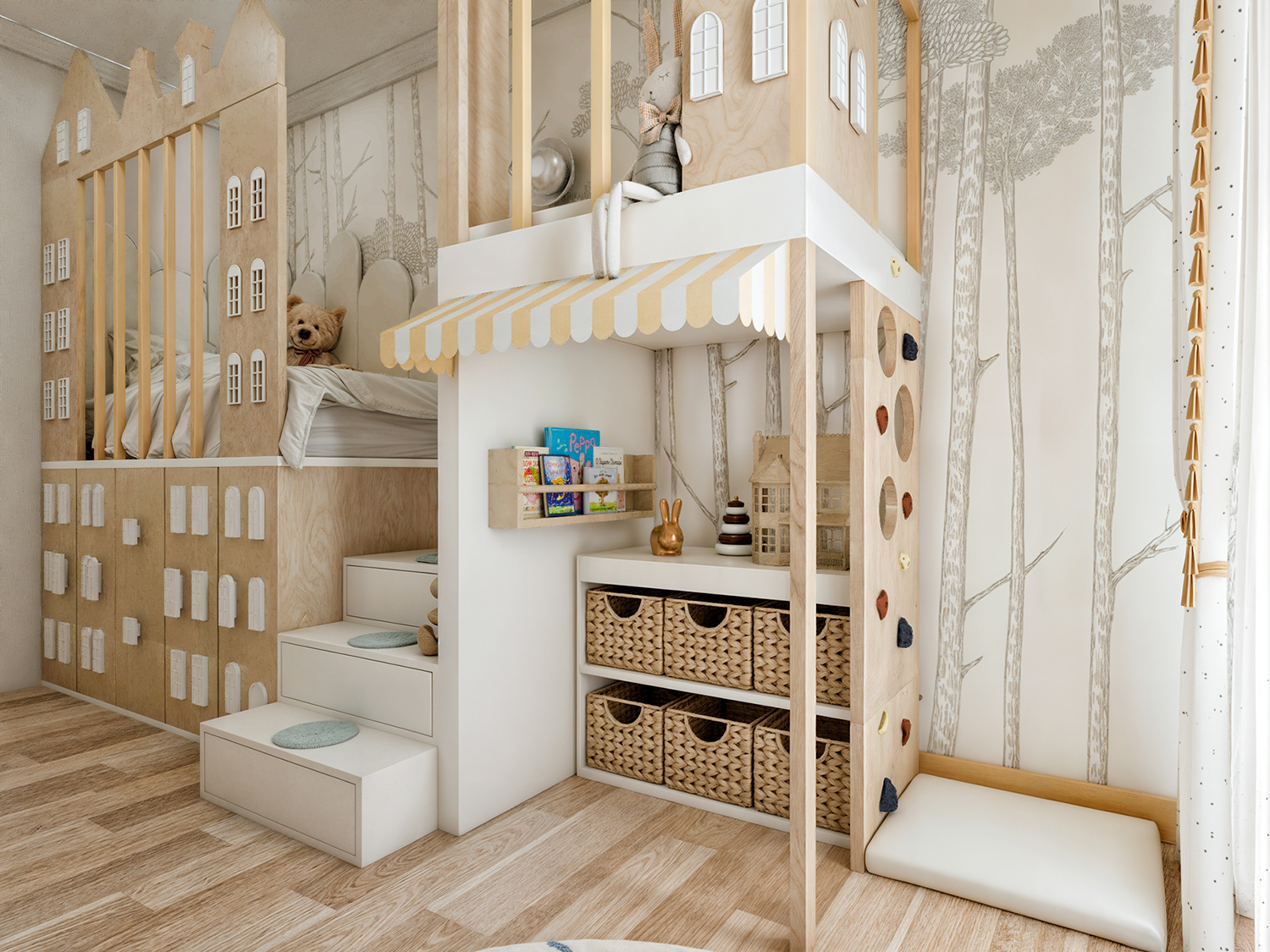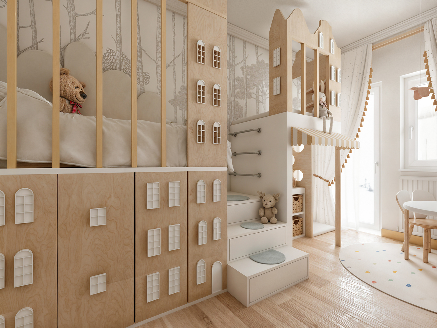 The design of this children's room, featuring a wooden structure that combines sleeping, playing, and learning, creates a true little kingdom for kids. This multifunctional centerpiece is placed at the heart of the room, offering not only practical solutions for daily activities but also endless possibilities for fostering imagination and creativity.
