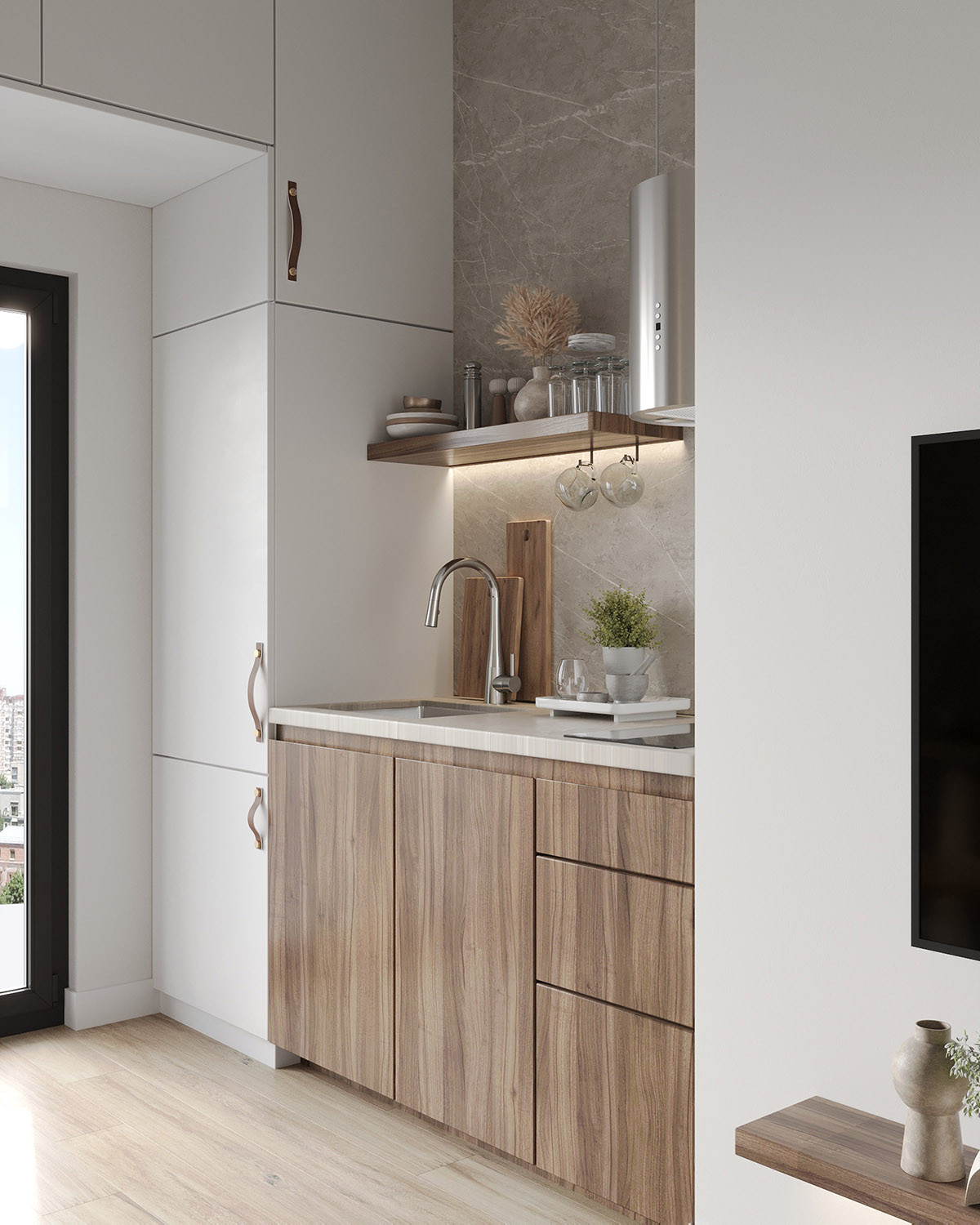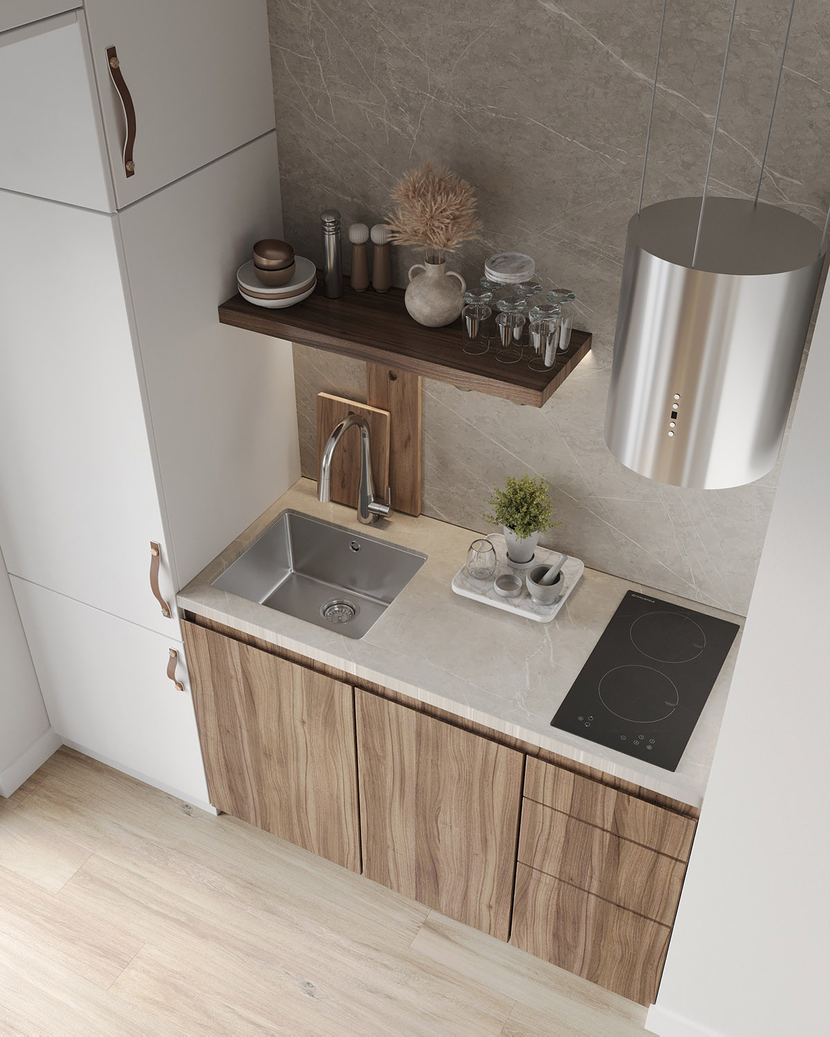 Additionally, careful consideration was given to the flow and circulation within the apartment, with a focus on optimizing spatial efficiency and enhancing the overall user experience. Thoughtful placement of furniture, strategic use of mirrors, and clever design details were employed to enhance the sense of openness and functionality within the compact footprint.