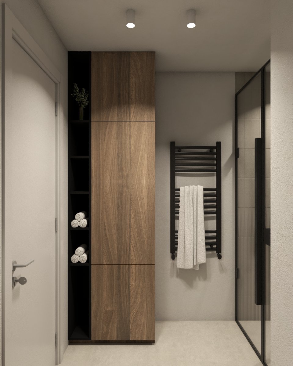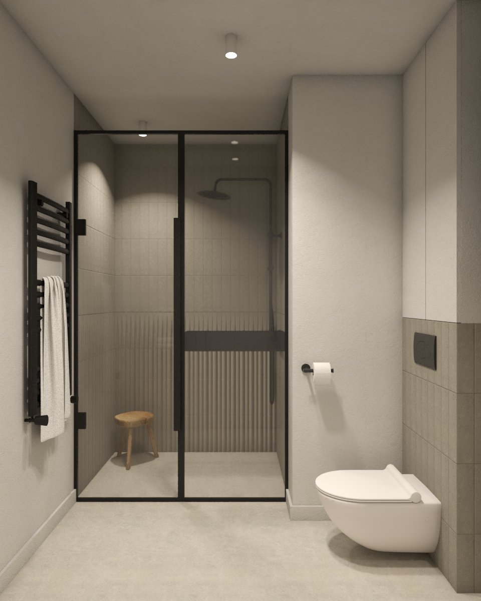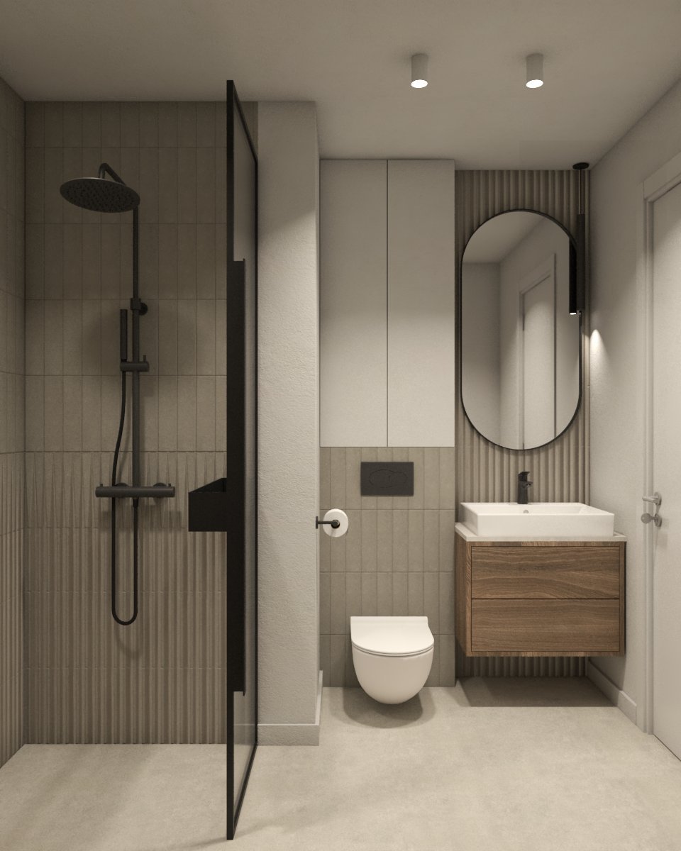 The shower bath features a sleek design with gray tiles that provide a modern backdrop. Wood tones add warmth and contrast, creating a cozy atmosphere. Black details, such as fixtures and accessories, add a touch of sophistication and sharpness to the overall look. The combination of these elements results in a clean, neat aesthetic that is both stylish and functional.