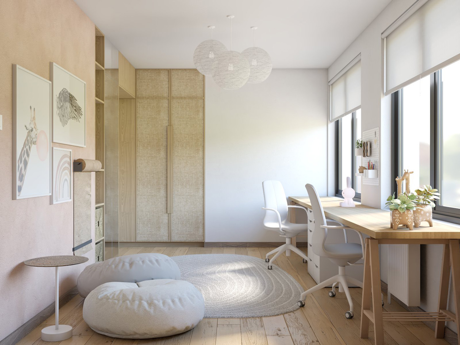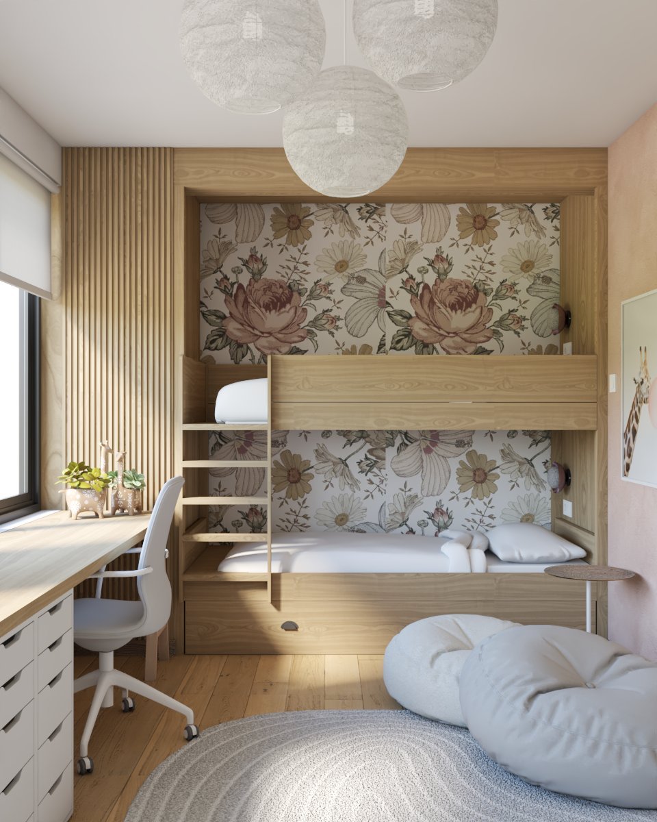 We wanted to create cosy and colorful space with interactive play zones and personalized work desks. Drawing inspiration from soft petals of a spring blossom, we decided to use colorful wallpaper to highlight the cosy bed nook. For the color palette we choose soft hues of light pink,, creating a fun and comforting atmosphere for two girls to enjoy this room.