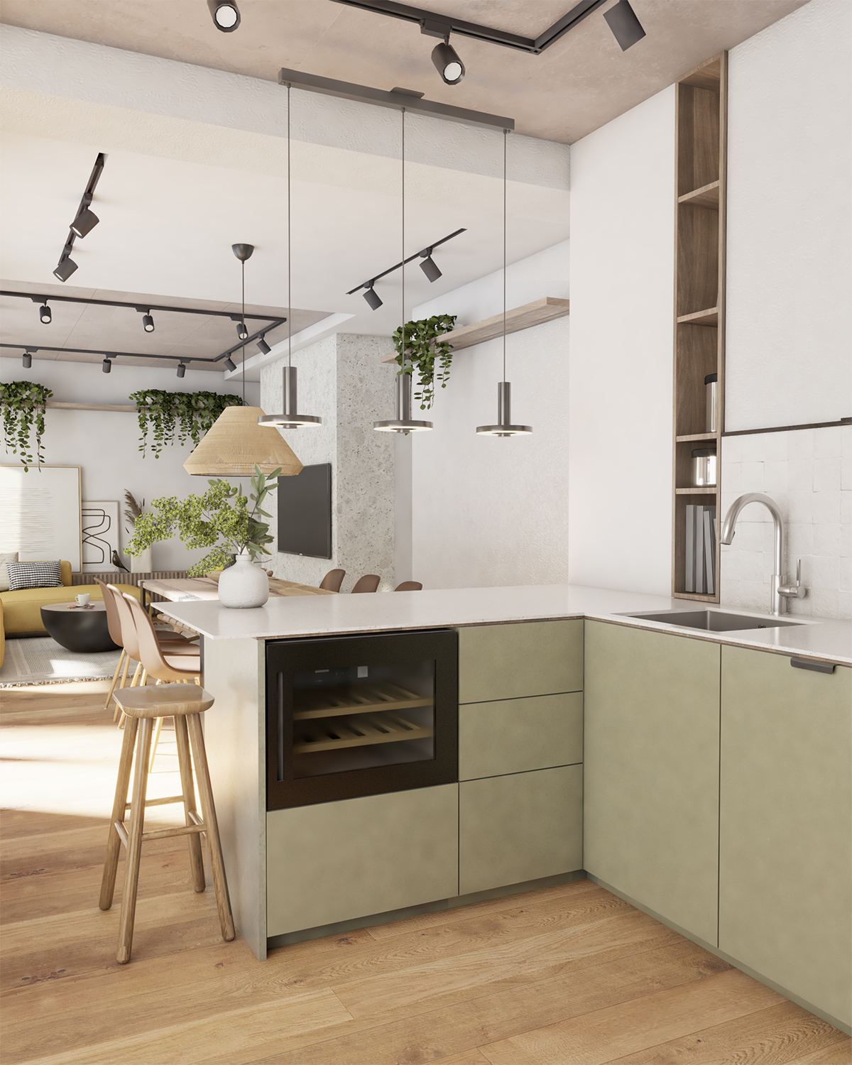 The client wanted green cabinets. We balanced the green with dark, slatted wood and white Corian countertop, striking the perfect balance between modern aesthetics and cozy vibes.