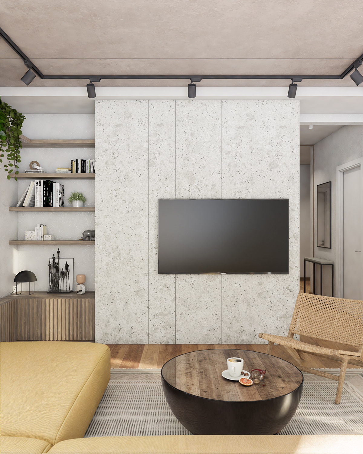 Inspired by our client's profession as a film director, we crafted this space around an iconic floor lamp reminiscent of classic film set lighting. The industrial-chic vibe, influenced by the lamp's style and our client's preferences, merges seamlessly with modern elements and the room's concrete ceiling. The coffee table was carefully chosen to mirror the lamp's half-dome shape, adding a touch of unity to the space.