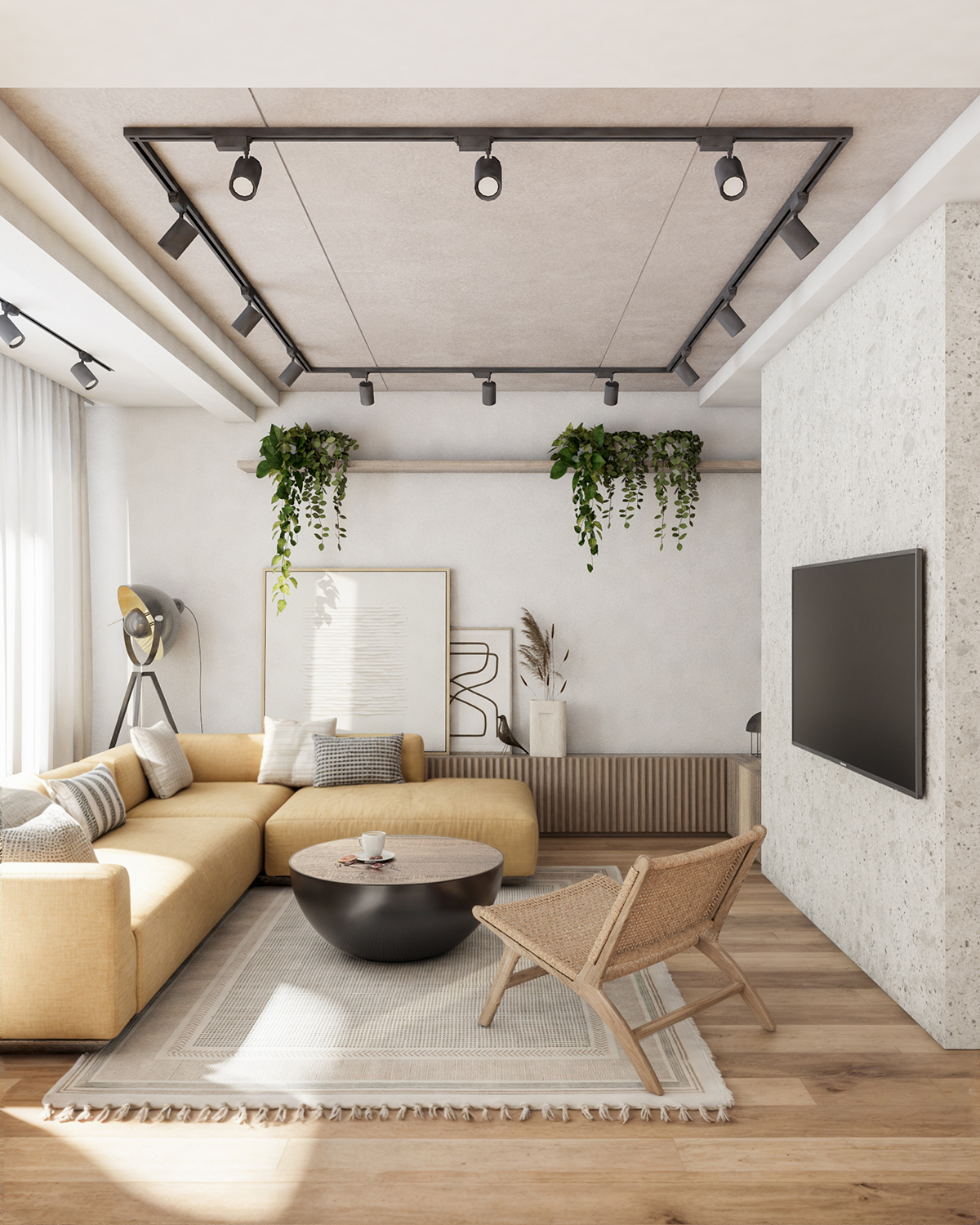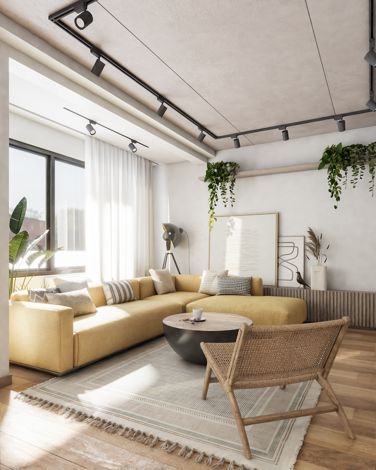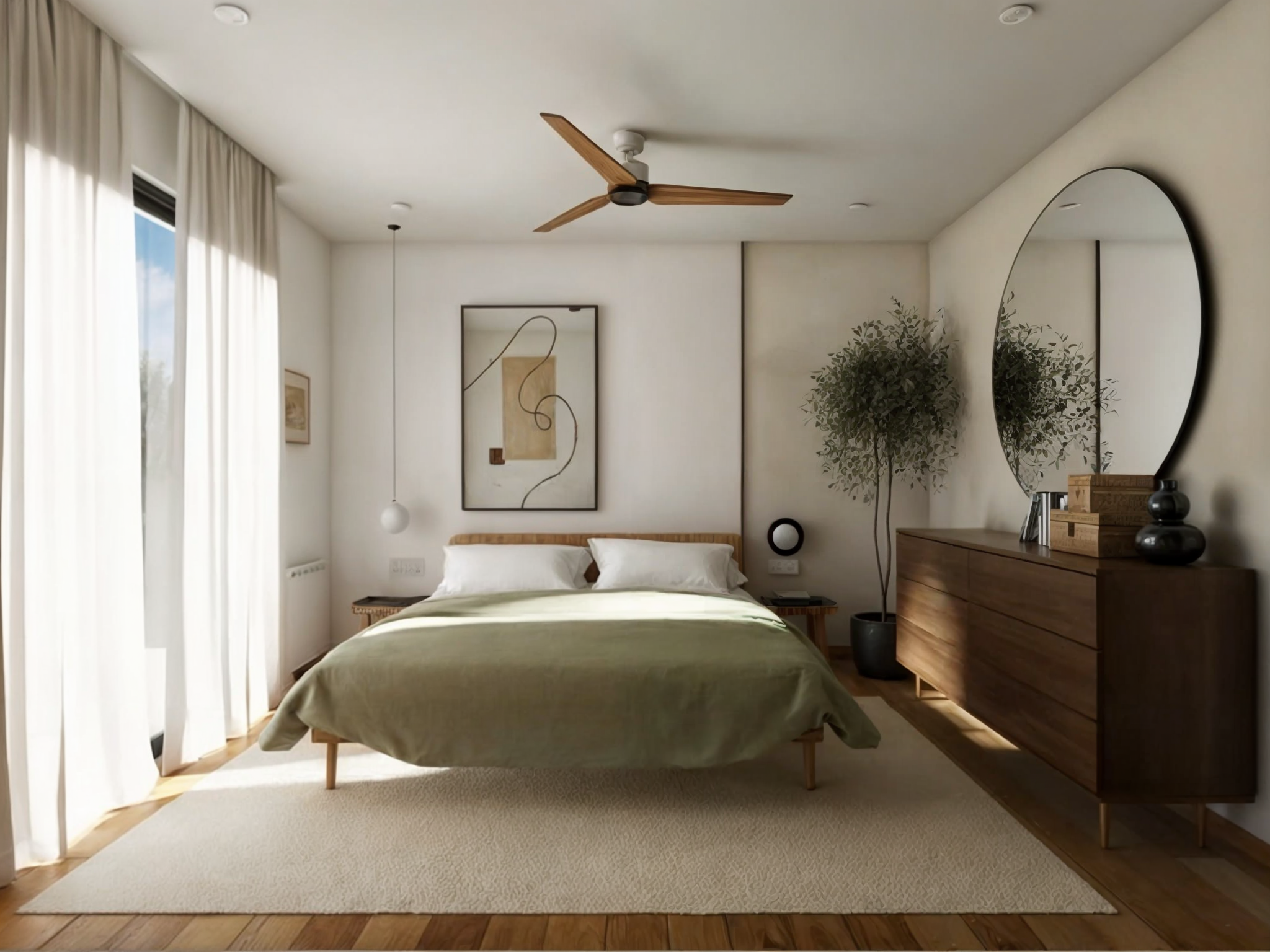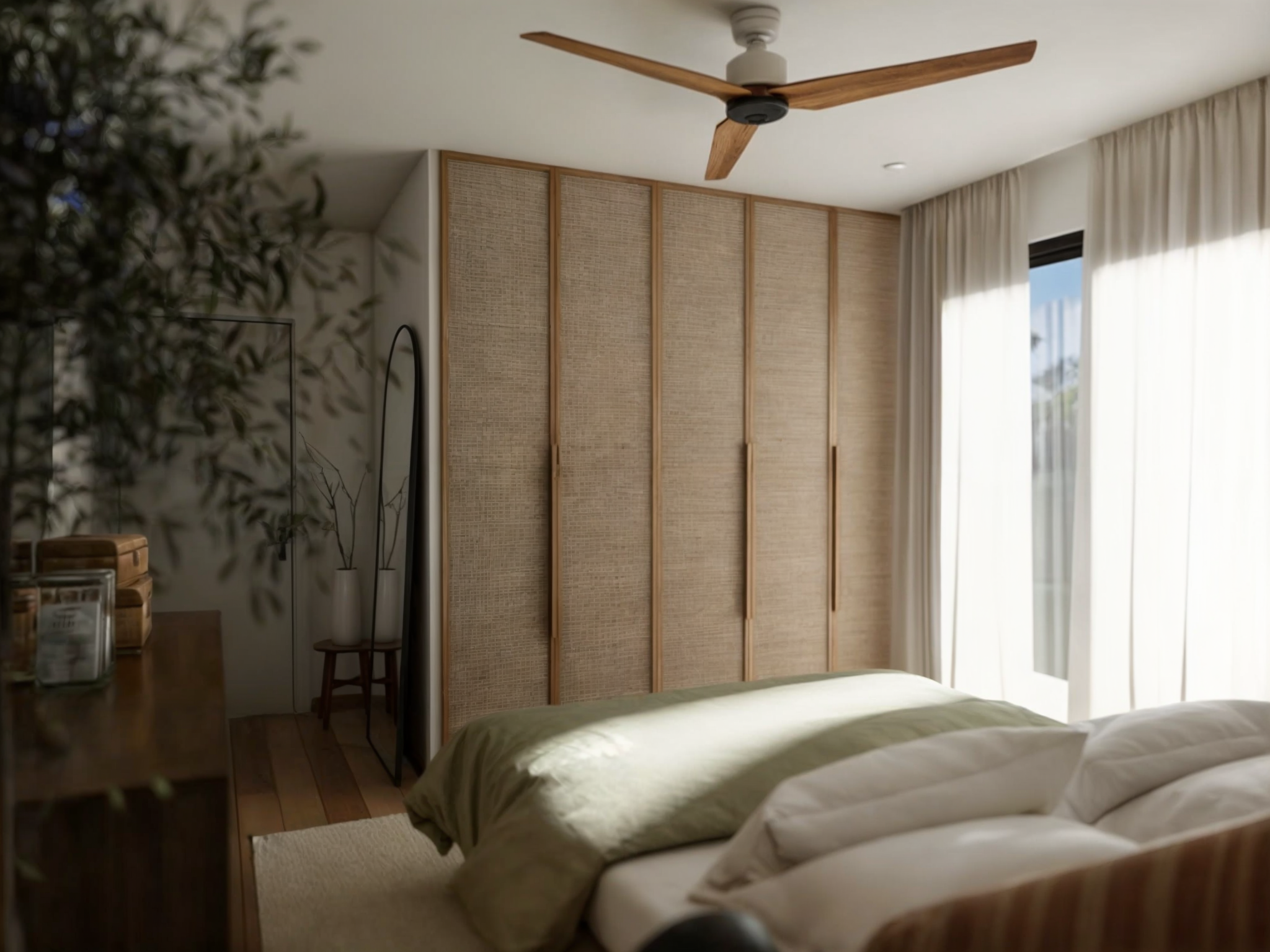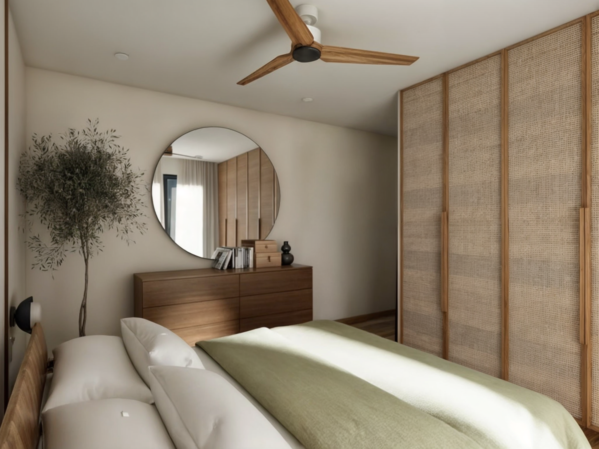 In designing the master bedroom, we focused on creating a calm and inviting space using natural materials. The use of rattan adds warmth and texture, while a large round mirror helps reflect light and makes the room feel more open. Soft, neutral colors enhance the natural vibe, and potted plants bring a touch of greenery indoors. This design creates a relaxing environment that feels connected to nature, perfect for unwinding at the end of the day.