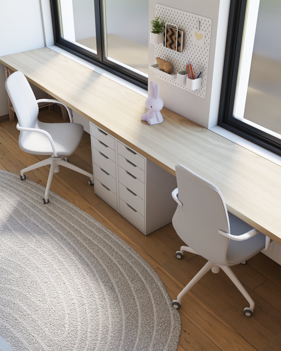 We wanted to create cosy and colorful space with interactive play zones and personalized work desks. Drawing inspiration from soft petals of a spring blossom, we decided to use colorful wallpaper to highlight the cosy bed nook. For the color palette we choose soft hues of light pink,, creating a fun and comforting atmosphere for two girls to enjoy this room.