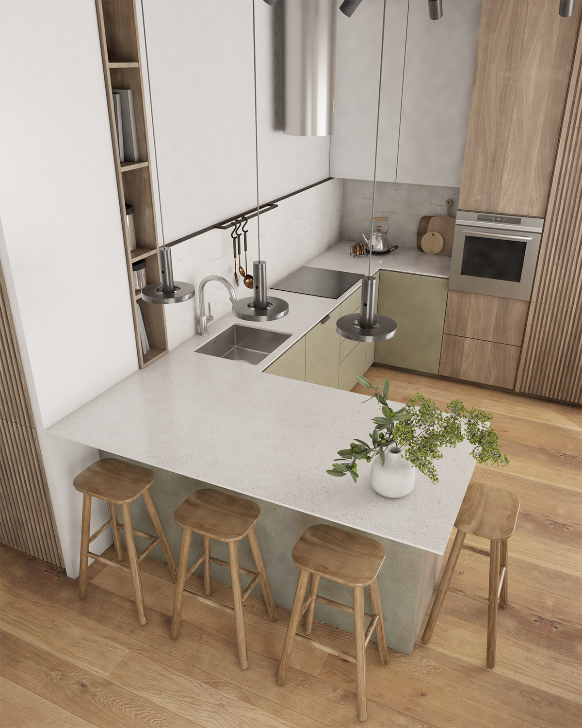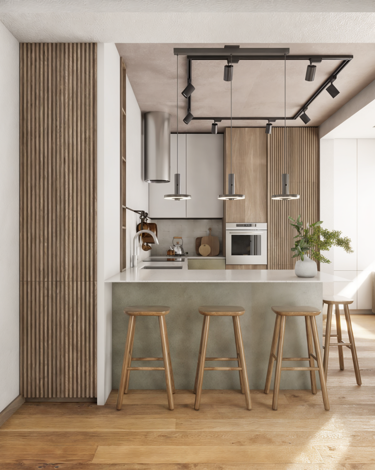 The client wanted green cabinets. We balanced the green with dark, slatted wood and white Corian countertop, striking the perfect balance between modern aesthetics and cozy vibes.