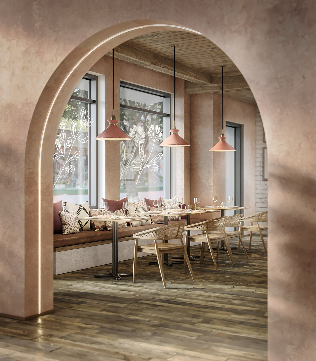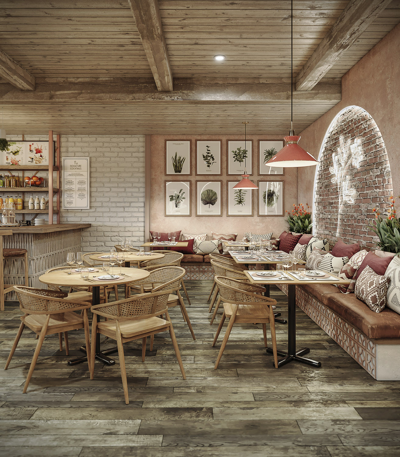 The primary challenges faced with the existing space stemmed from its excessive darkness and a discordance among its elements. The walls, entirely composed of brick, contributed to this somber ambiance, exacerbated by a rectangular opening dividing the restaurant's rooms, crowned by a large, exposed iron beam. This rugged aesthetic, we felt, detracted from the desired atmosphere. To remedy this, we conceived the idea of introducing arches - not only to conceal the opening but also to harmonize the space. These arches, strategically positioned as niches along the walls, artfully expose sections of the brick while covering the majority, striking a delicate balance. Embracing the Mediterranean essence, we enriched the space with rustic plaster wall finishes and complemented the existing wooden ceiling with wooden beams. Leather cushions adorning the banquettes, accompanied by boho decorative pillows in hues of burgundy, black, and white, further elevate the ambiance, creating a warm and inviting atmosphere.