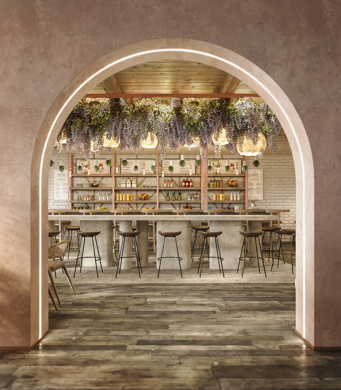The Thyme & Tonic project offers a refreshing take on the redesign of a Mediterranean restaurant, drawing inspiration from the enchanting elements of its outdoor garden. The decision to integrate a pink-ish color scheme was a nod to the beloved Wisteria flowers and other pink accents adorning the exterior space, thereby seamlessly blending the restaurant's indoor ambiance with its outdoor allure.