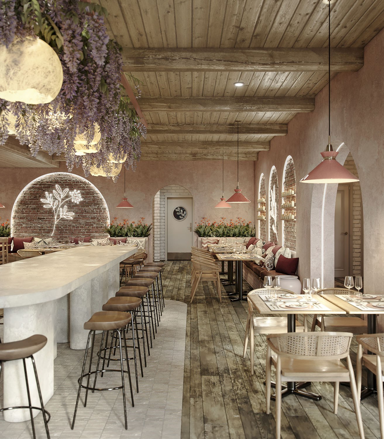 This project aimed to revitalize an established Mediterranean restaurant through a comprehensive redesign. Drawing inspiration from the captivating outdoor garden adorned with Wisteria flowers and beloved pink accents, we endeavored to infuse the interior with the same enchanting allure. Thus, the decision to adopt a pink-ish color palette was a natural extension of the outdoor ambiance, seamlessly integrating elements that patrons cherished into the restaurant's interior aesthetic.