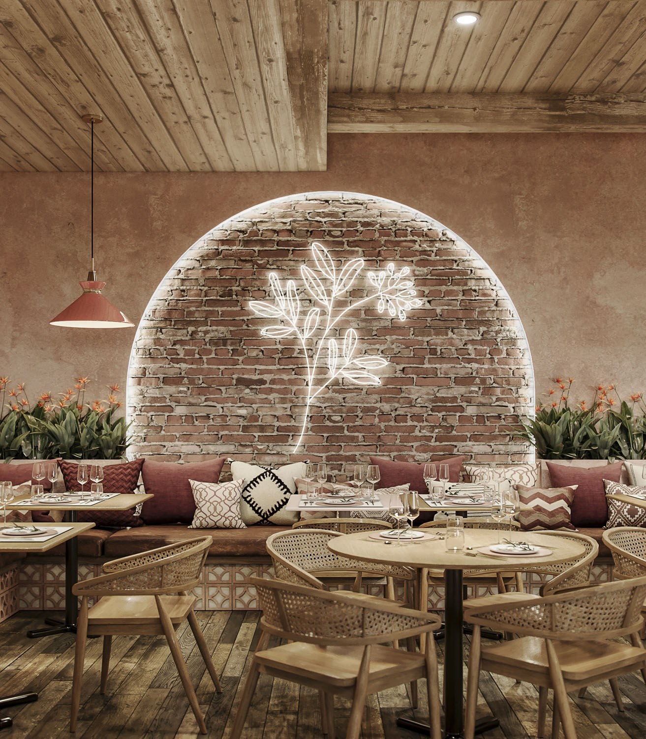 The primary challenges faced with the existing space stemmed from its excessive darkness and a discordance among its elements. The walls, entirely composed of brick, contributed to this somber ambiance, exacerbated by a rectangular opening dividing the restaurant's rooms, crowned by a large, exposed iron beam. This rugged aesthetic, we felt, detracted from the desired atmosphere. To remedy this, we conceived the idea of introducing arches - not only to conceal the opening but also to harmonize the space. These arches, strategically positioned as niches along the walls, artfully expose sections of the brick while covering the majority, striking a delicate balance. Embracing the Mediterranean essence, we enriched the space with rustic plaster wall finishes and complemented the existing wooden ceiling with wooden beams. Leather cushions adorning the banquettes, accompanied by boho decorative pillows in hues of burgundy, black, and white, further elevate the ambiance, creating a warm and inviting atmosphere.