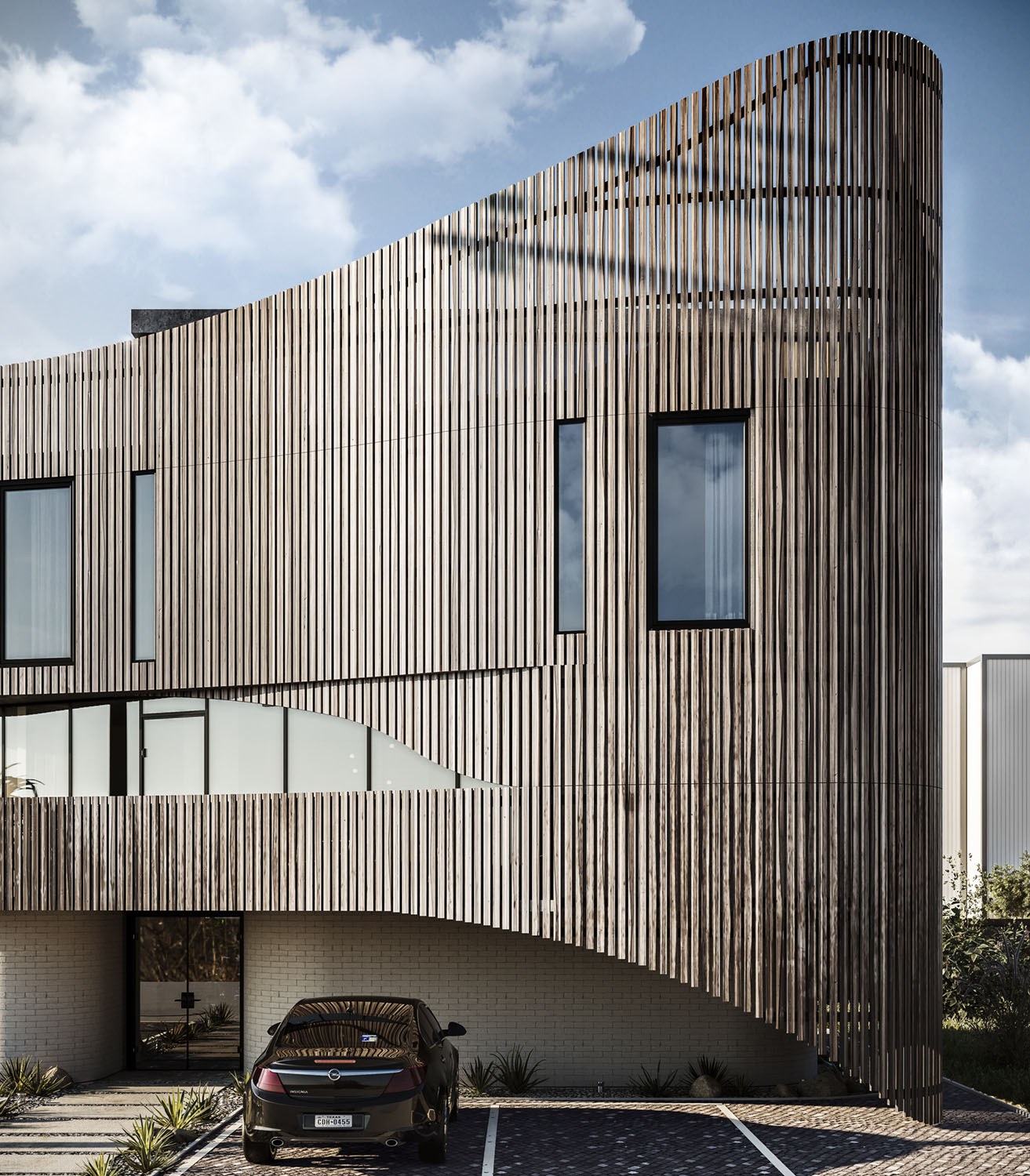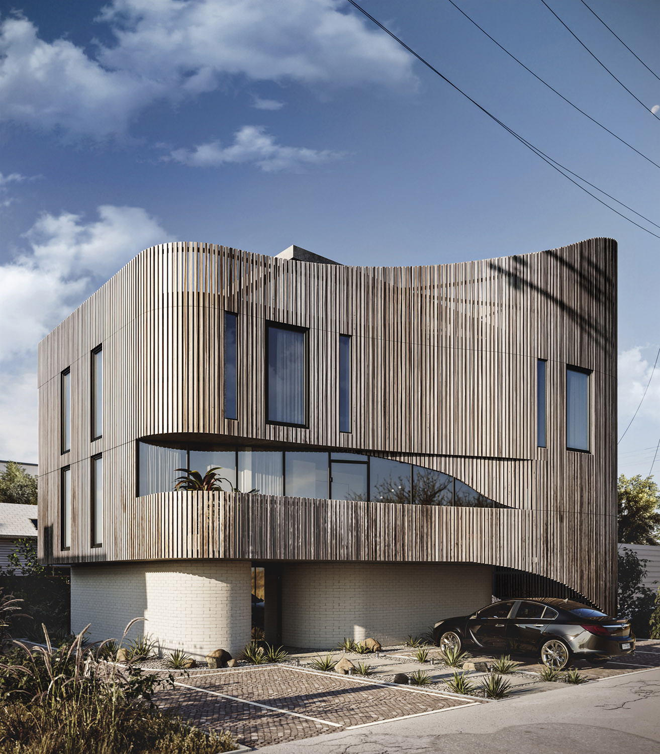 Situated in Houston, USA, the building project entails the construction of a residential complex comprising two spacious apartments and a micro-apartment atop, along with several communal areas. The design concept is meticulously crafted around the plot's shape, orientation, and the diverse spatial requirements necessitated by the project. Despite the challenge of a limited plot area, mandating a compact arrangement to accommodate the desired apartment spaces, the initial cubic form lacked finesse. To overcome this, we opted for a more fluid architectural expression to seamlessly integrate the structure within its surroundings.